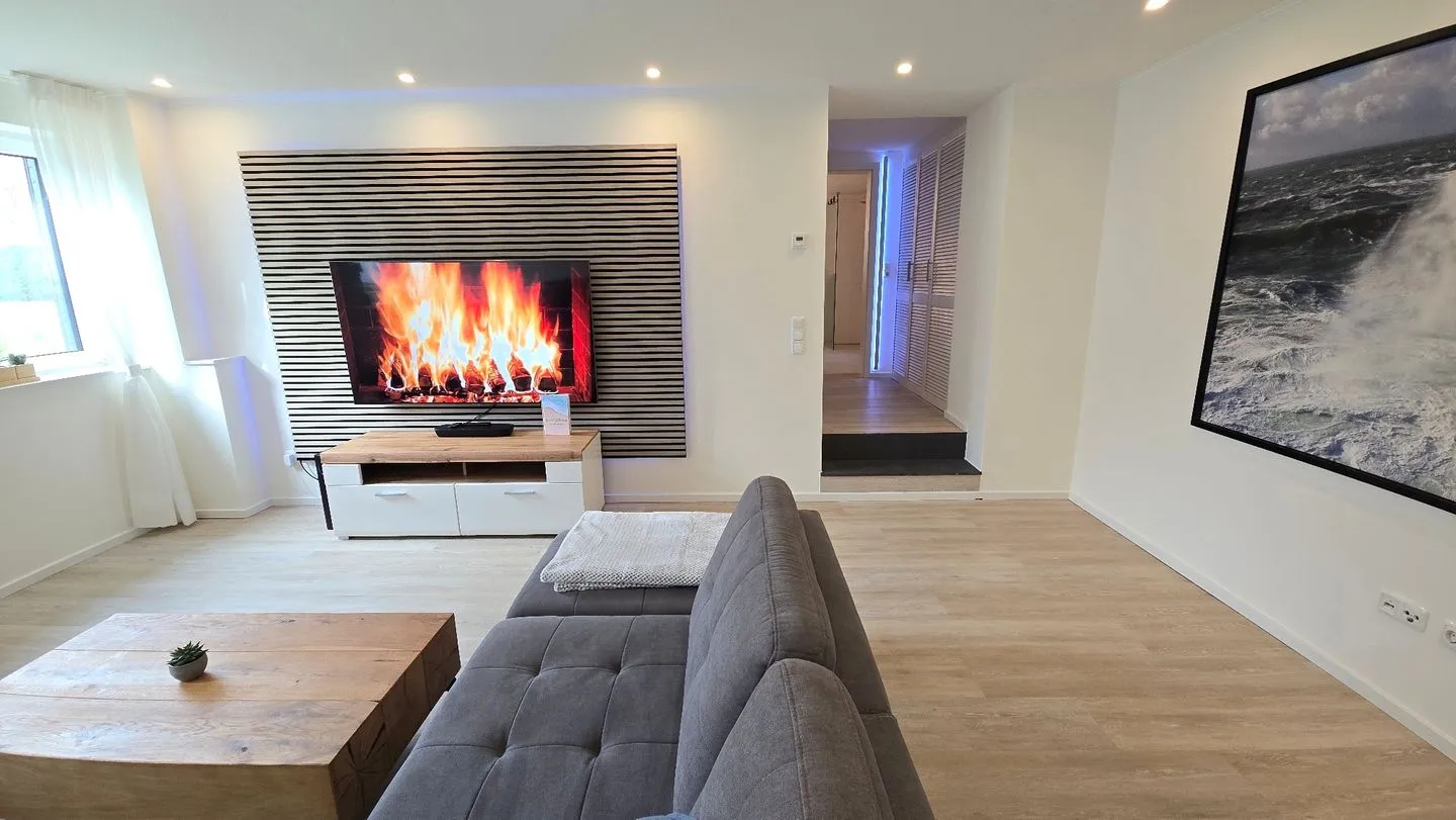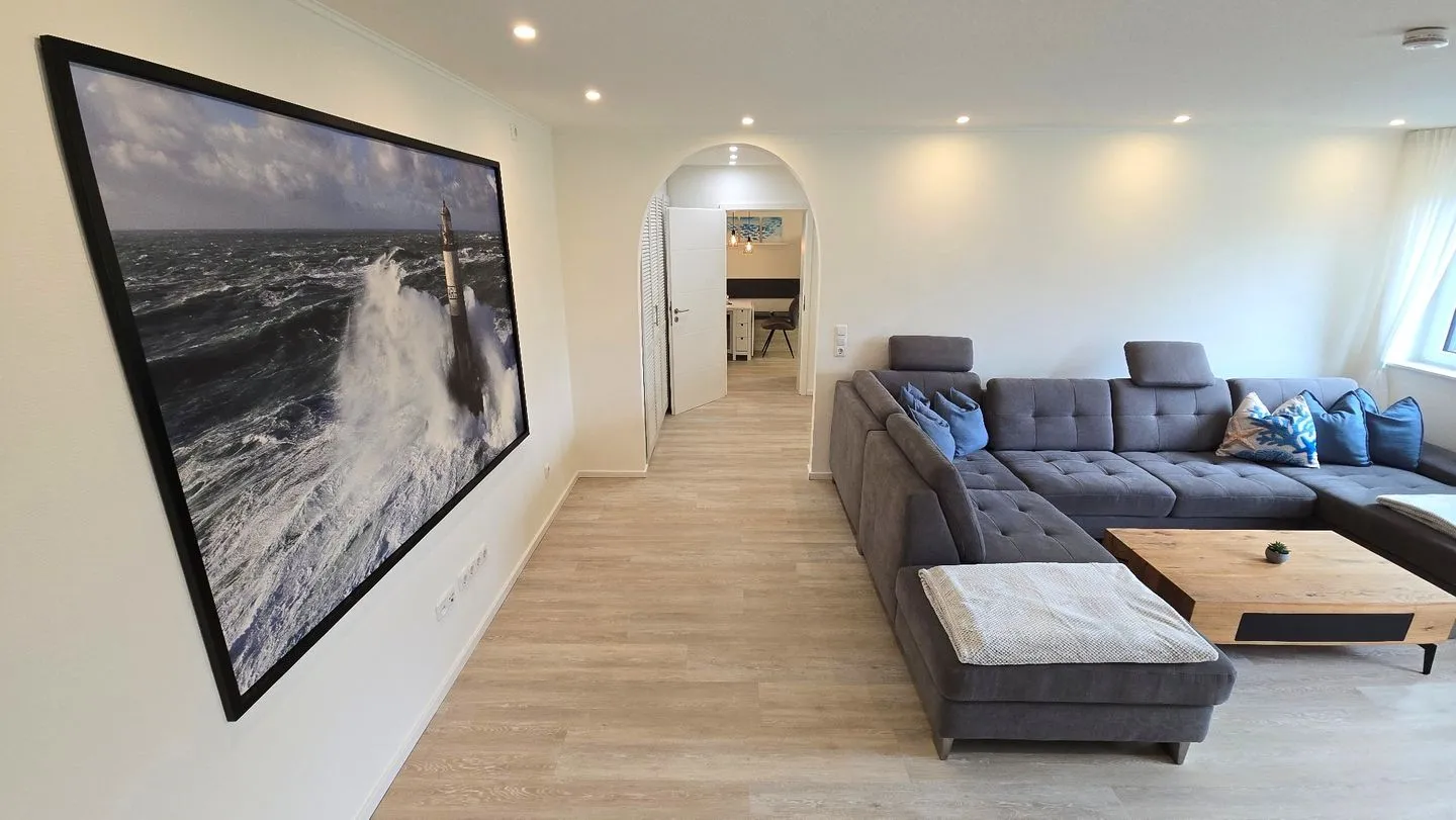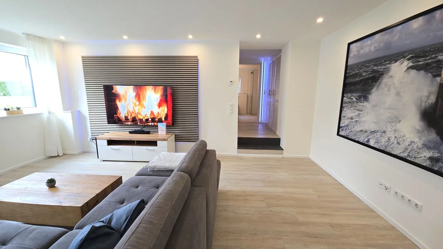 Der helle Wohnbereich bildet das Herzstück der Wohnung und lädt zum Entspannen und Wohlfühlen ein. Nach einem Tag am Strand oder einer Fahrradtour durch die Umgebung könnt ihr es euch auf der großzügigen Couch bequem machen, gemeinsam einen Film schauen oder einfach den Tag in ruhiger Atmosphäre ausklingen lassen.