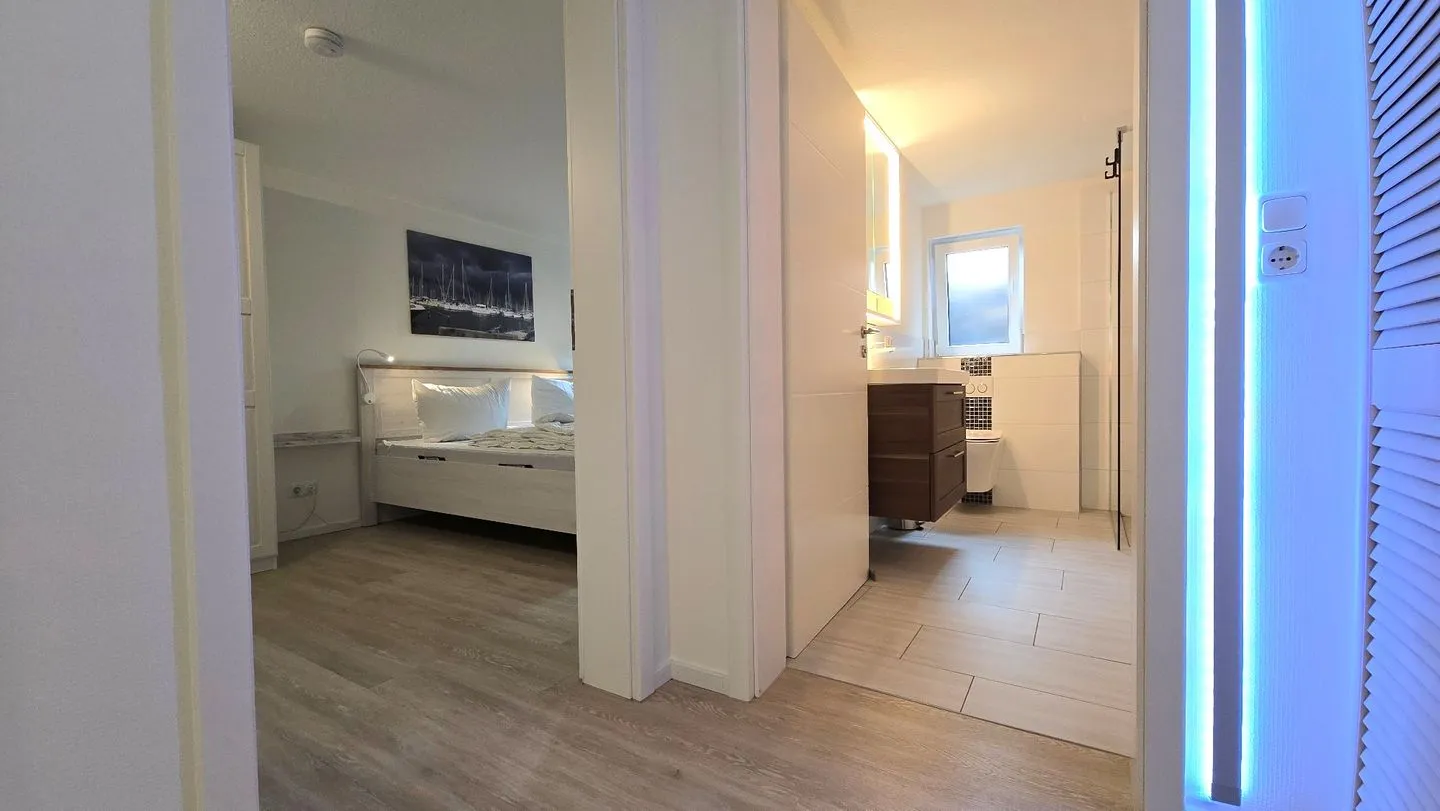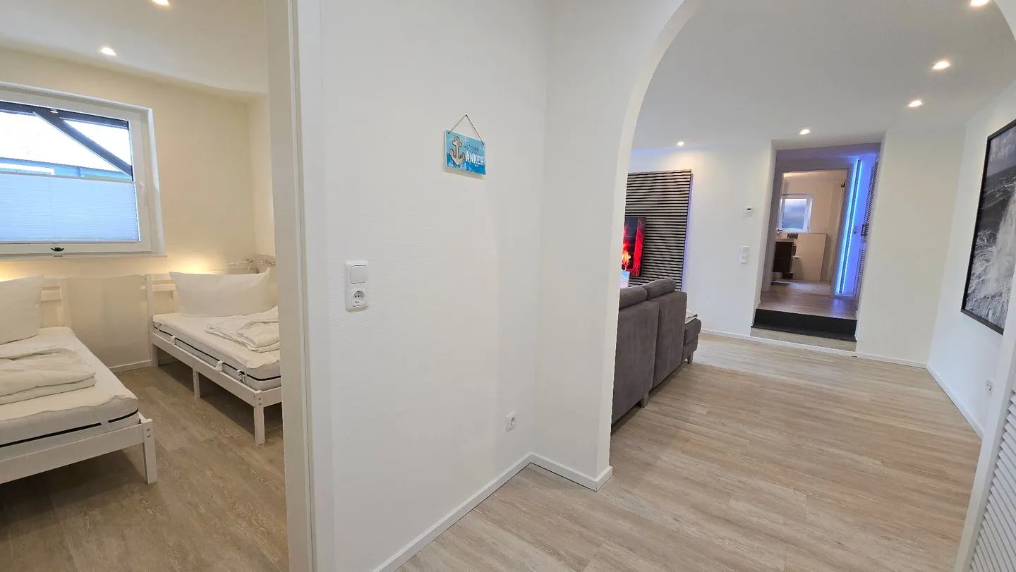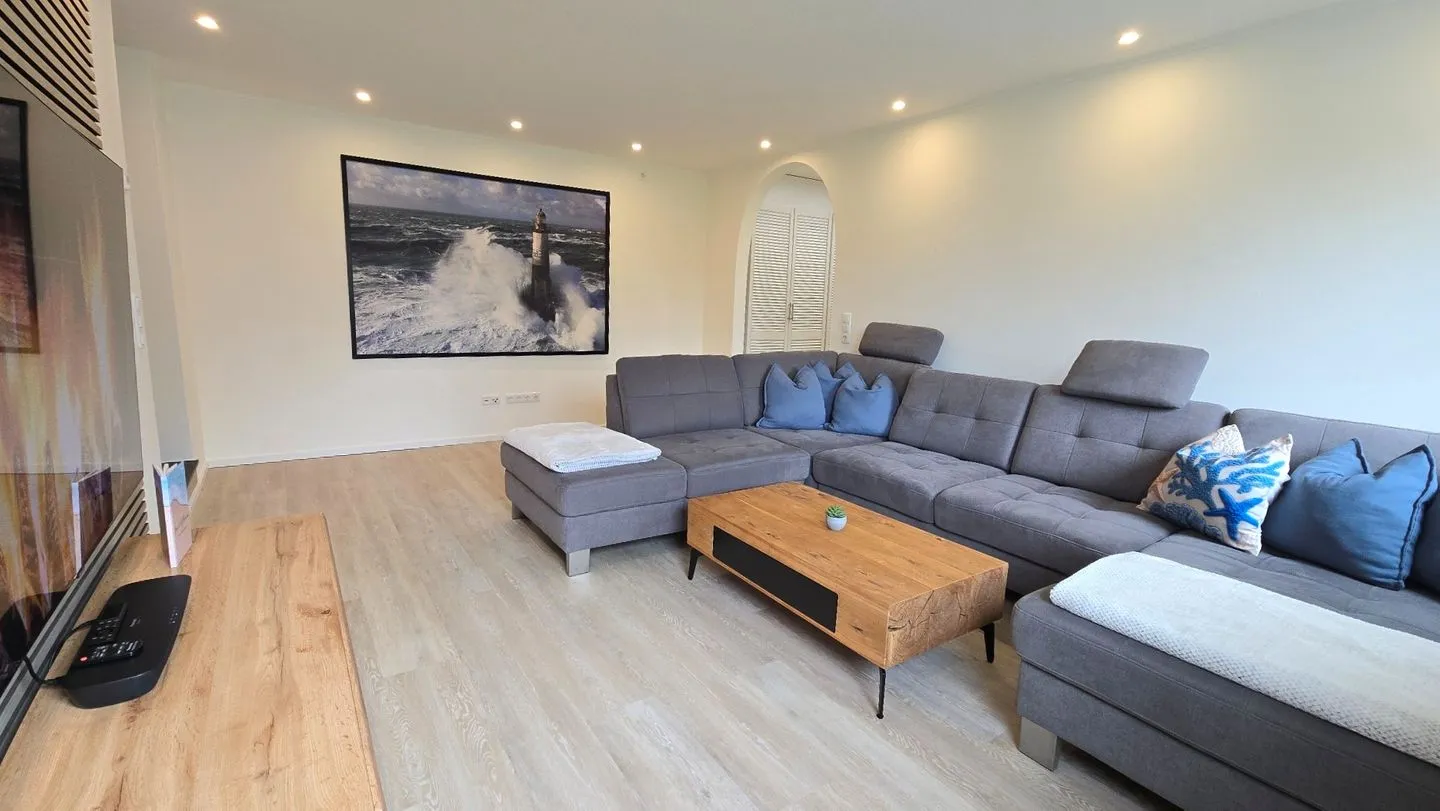 Der helle Wohnbereich bildet das Herzstück der Wohnung und lädt zum Entspannen und Wohlfühlen ein. Nach einem Tag am Strand oder einer Fahrradtour durch die Umgebung könnt ihr es euch auf der großzügigen Couch bequem machen, gemeinsam einen Film schauen oder einfach den Tag in ruhiger Atmosphäre ausklingen lassen.